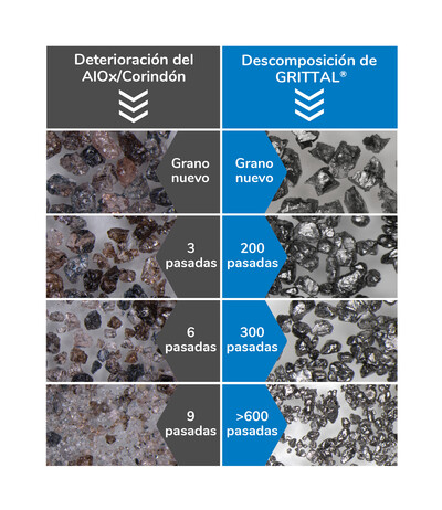 La comparación de los abrasivos muestra claramente la descomposición del corindón tras solo unos pocos usos, en contraste con GRITTAL®.