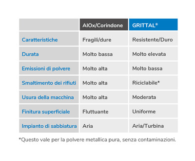 La tabella mostra i mezzi abrasivi Korund e GRITTAL® a confronto, tra l’altro per quanto riguarda le proprietà, la produzione di polvere, lo smaltimento e l’usura delle macchine.