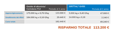 Esempio pratico: l'utilizzo di GRITTAL® al posto del corindone (ossido di alluminio) comporta i seguenti risparmi: