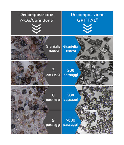 Il confronto dei granuli abrasivi mostra chiaramente la disgregazione del corindone dopo solo pochi utilizzi, a differenza di GRITTAL®.